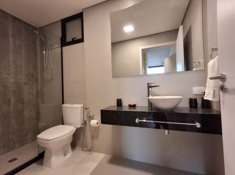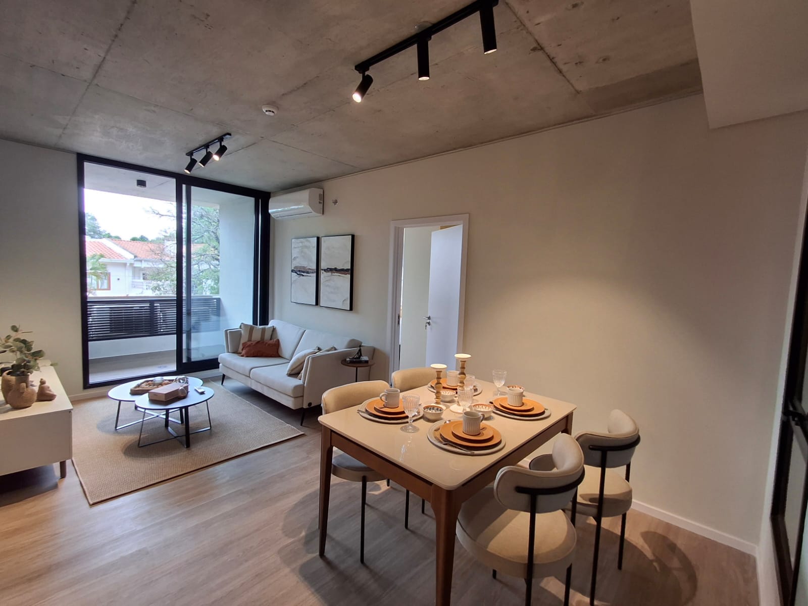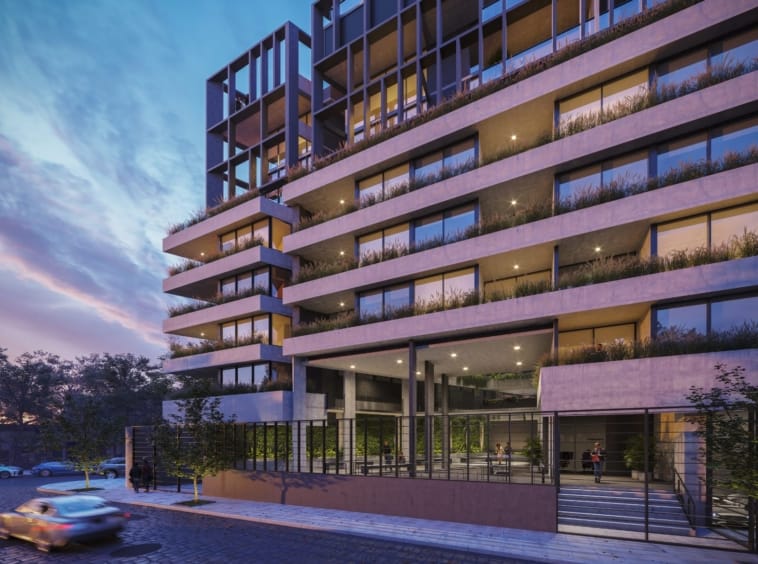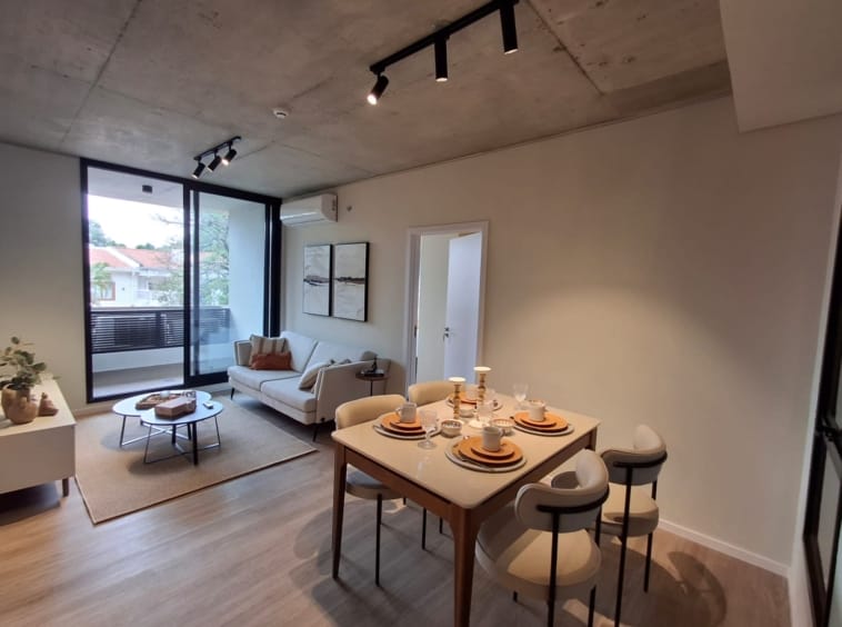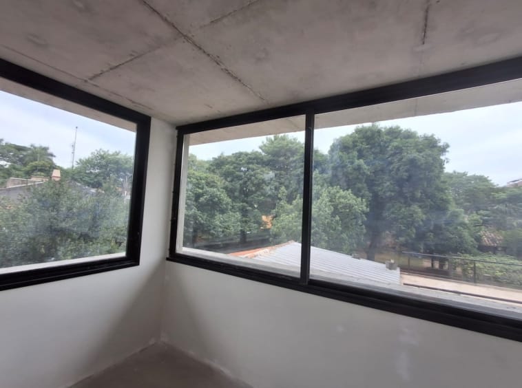 Pisos y baños con porcelanato de alta calidad, cielorrasos de hormigón vistos o pintados, marcos de ventanas y puertas exteriores de aluminio o PVC con vidrios DVH.